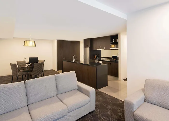 Quay West Suites Melbourne is an upscale option situated in the CBD, providing spacious accommodations ideal for families and longer stays. Guests can enjoy panoramic views of the Yarra River from their suites equipped with kitchen facilities. The hotel's amenities include a 15-metre indoor lap pool, spa, and fitness center, encouraging relaxation and well-being. Dining options include the Jarrah Restaurant & Bar, while cultural attractions like the Melbourne Arts Precinct are just a short stroll away. Proximity to public transport makes navigating the city seamless.