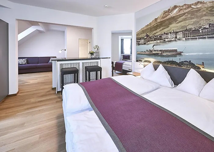 Hotel Central Luzern is situated in a quieter part of the bustling Neustadt quarter. All rooms are non-smoking and designed with bright, modern decor. Guests can enjoy a rich Swiss buffet breakfast included in their stay. The hotel offers amenities suitable for families. Its prime location near public transport and cultural sites ensures easy exploration of all Lucerne has to offer.
